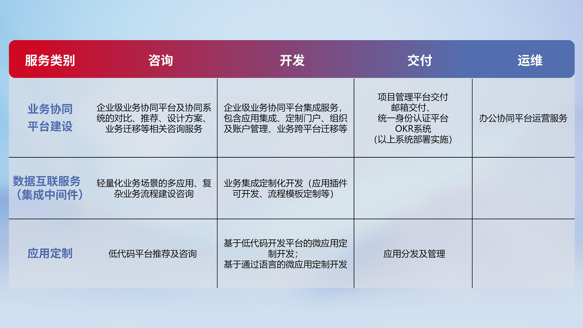 针对钉钉、、企微、、、IDaas等平台级产品提供产品的规划、、、、方案、、、、交付、、定制化开发等服务,,实现如统一协同办公、、、、智能客户服务、、混合会议管理、、、智能数据查询、、等业务场景,,,,实现数字化转型。。