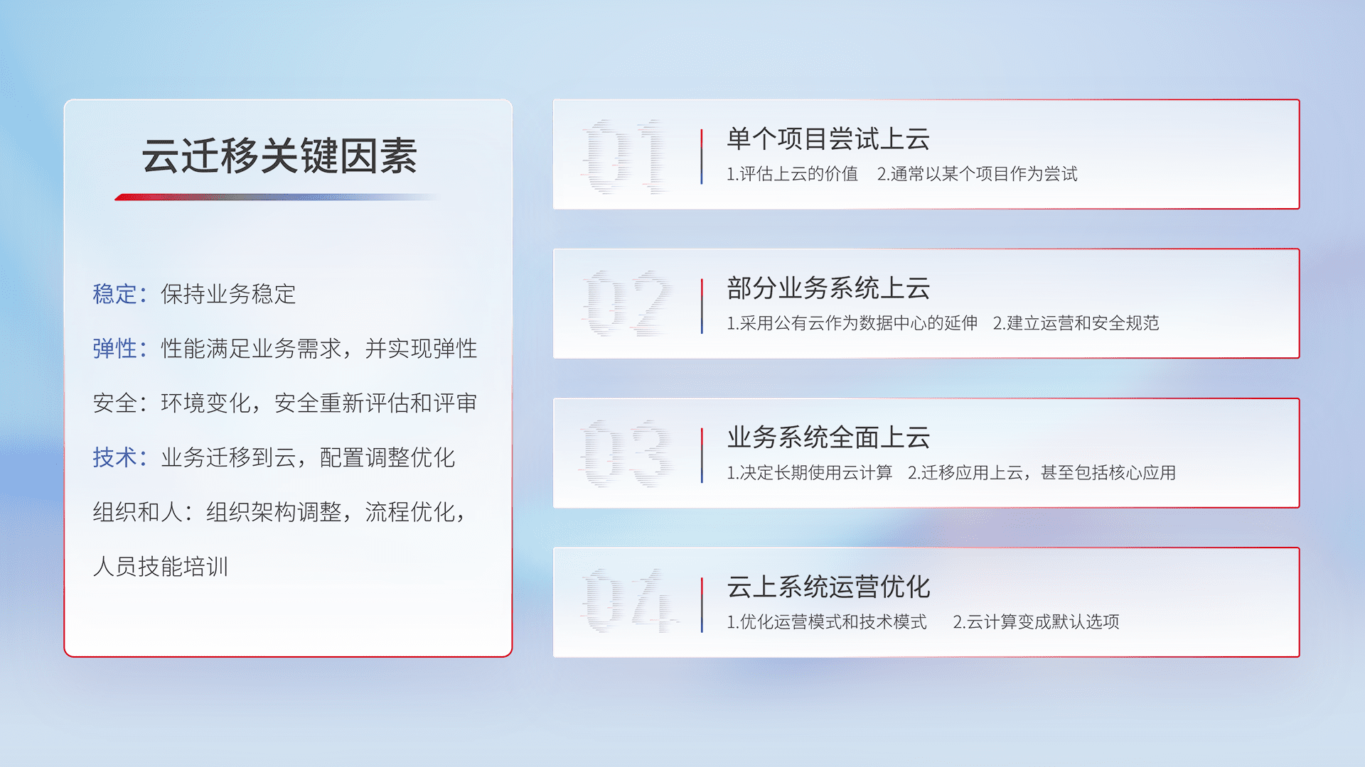 结合实际业务,,,,从规划设计、、、云平台选型、、云原生改造、、、数据迁移、、、集成交付,,,迁移全过程为客户识别最佳上云路径,,,,做好风险识别管理,,设计网络架构、、、、身份权限、、、安全审计合规、、操作审计、、、日志审计、、、监控告警策略、、、、多站点容灾设计等,,,,对云上基础设施进行整体规划,,提升IT治理水平,,,,以满足弹性、、、高可用、、、、高性能的需求。。。