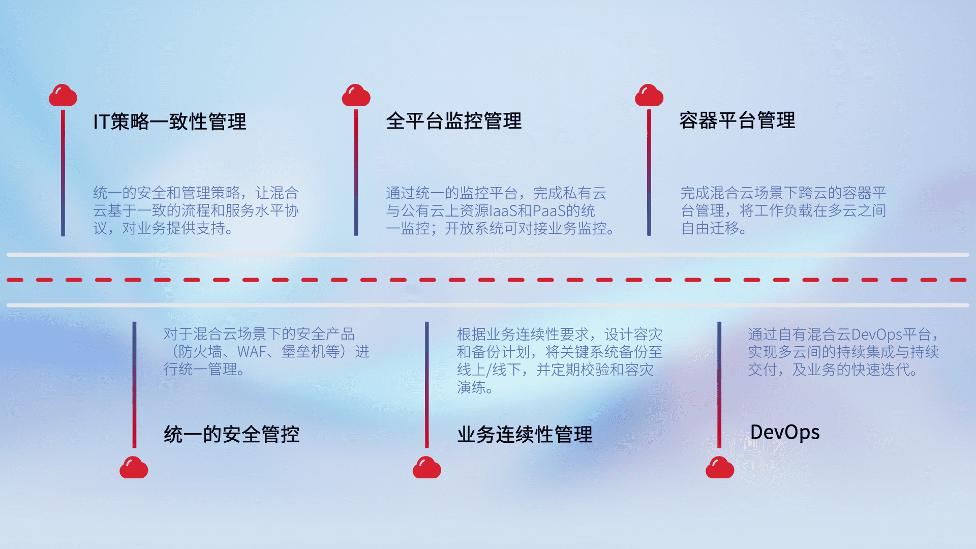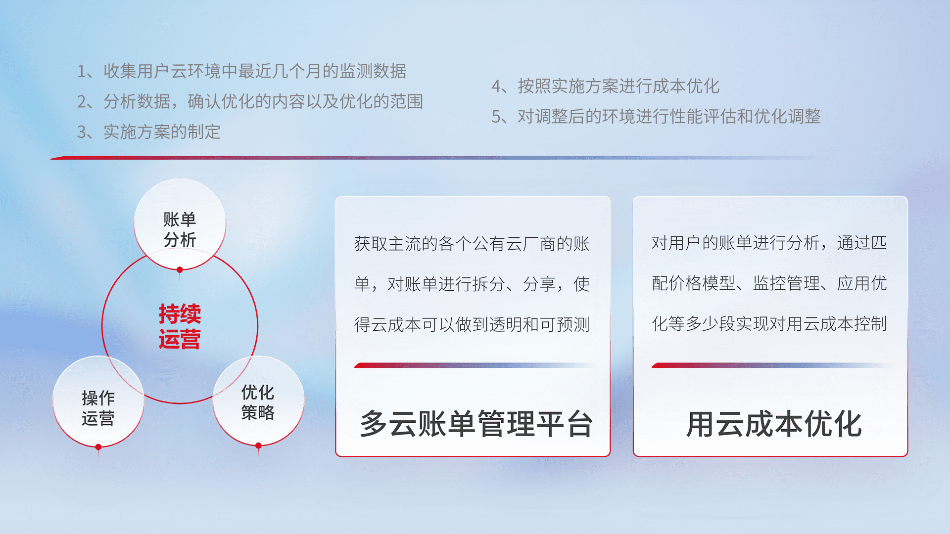 通过多云纳管,,,以统一的资源数据模型把客户的云资源进行抽象和封装,,,进而实现对多云资源的统一操作,,,保障云资源管理的可靠性、、、稳定性与可用性。。。。量身定制化运维内容,,配置、、开发运维、、、补丁管理、、备份、、监控、、、、认证和访问管理、、、、审计和日常巡检等,,保障在用云过程中的可靠度,,稳定度以及高可用率。。。。