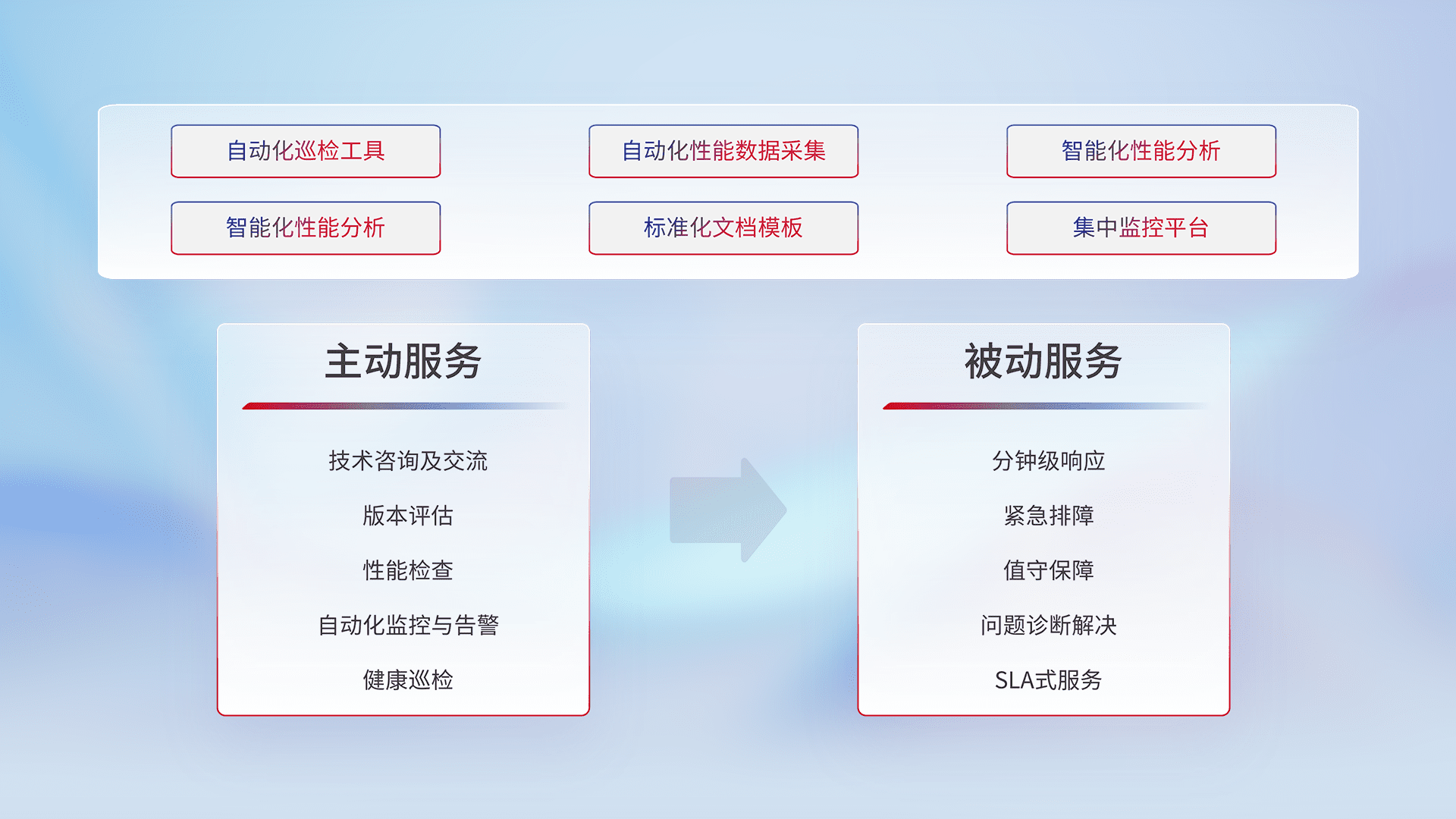 智能化工具和标准化文档,,保障服务质量,,,提供主动服务(包含技术咨询、、、版本评估、、性能检查、、自动化监控与告警、、、健康巡检)和被动服务包含(分钟级响应、、、紧急排障、、值守保障、、、问题诊断解决、、SLA服务)。。